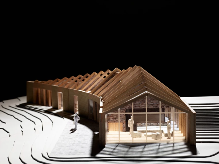 The design distorts the boat hull to follow the contour lines and protect the habitat from recurring winds. One can face the view at the larboard and enter the house like a boat to dock on the starboard side. The master suite, akin to the captain's quarters, stands at the vessel's bow while the living areas take all the stern's width. The house is designed for a pair and has two guest rooms upstairs in the double-height that one could see as the boat's slip. All the structure and window frames are made of wood, while the infilling are in dry stone.