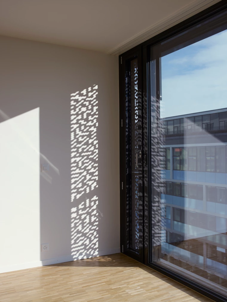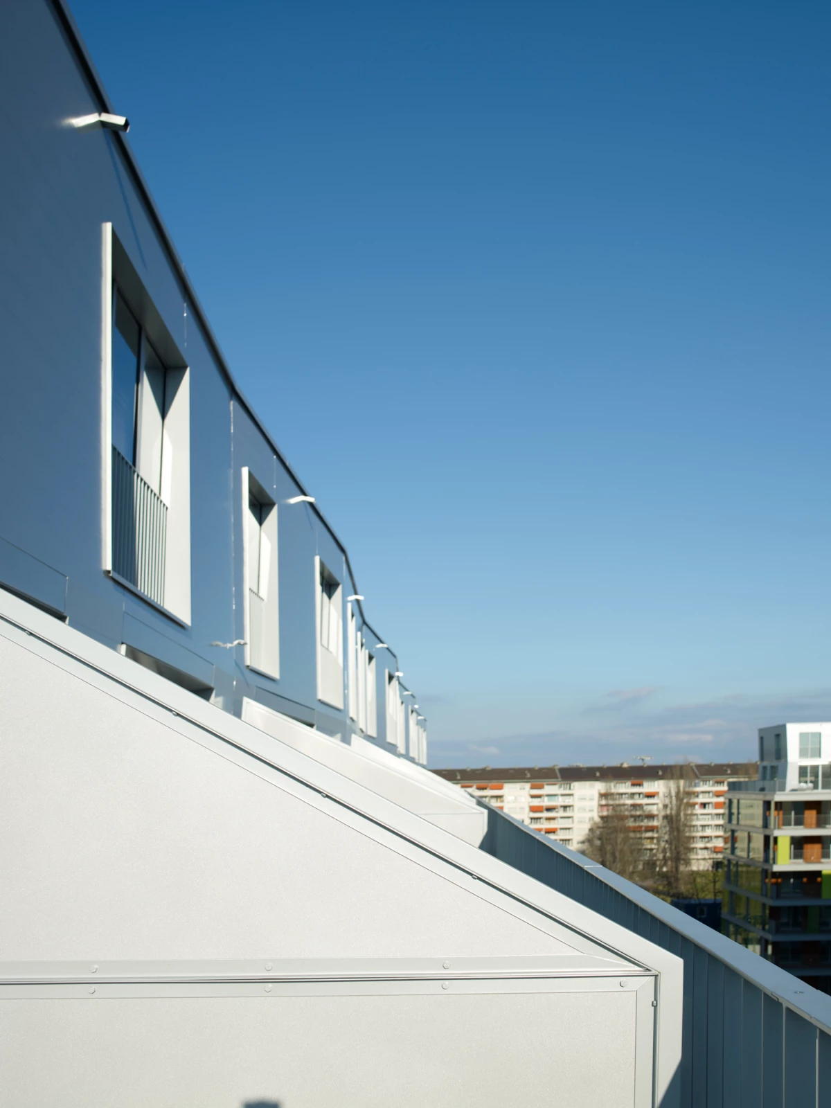 Designed by our founding partners when at group8, the building has no balconies. It shows a glass front with large bay windows that connect living spaces with the outdoors. Orange, red and purple blinds animate the facade. Airflow units in between the bay windows bear pierced metal sheets with coral motifs. On the opposite front, the rough-coated wall shows fewer and smaller windows for the bedrooms area. The attic offers duplex apartments with a waved appearance, just as in the Bambou Residence. It displays aluminium sheeting, leaving the building's top to fade into the sky.