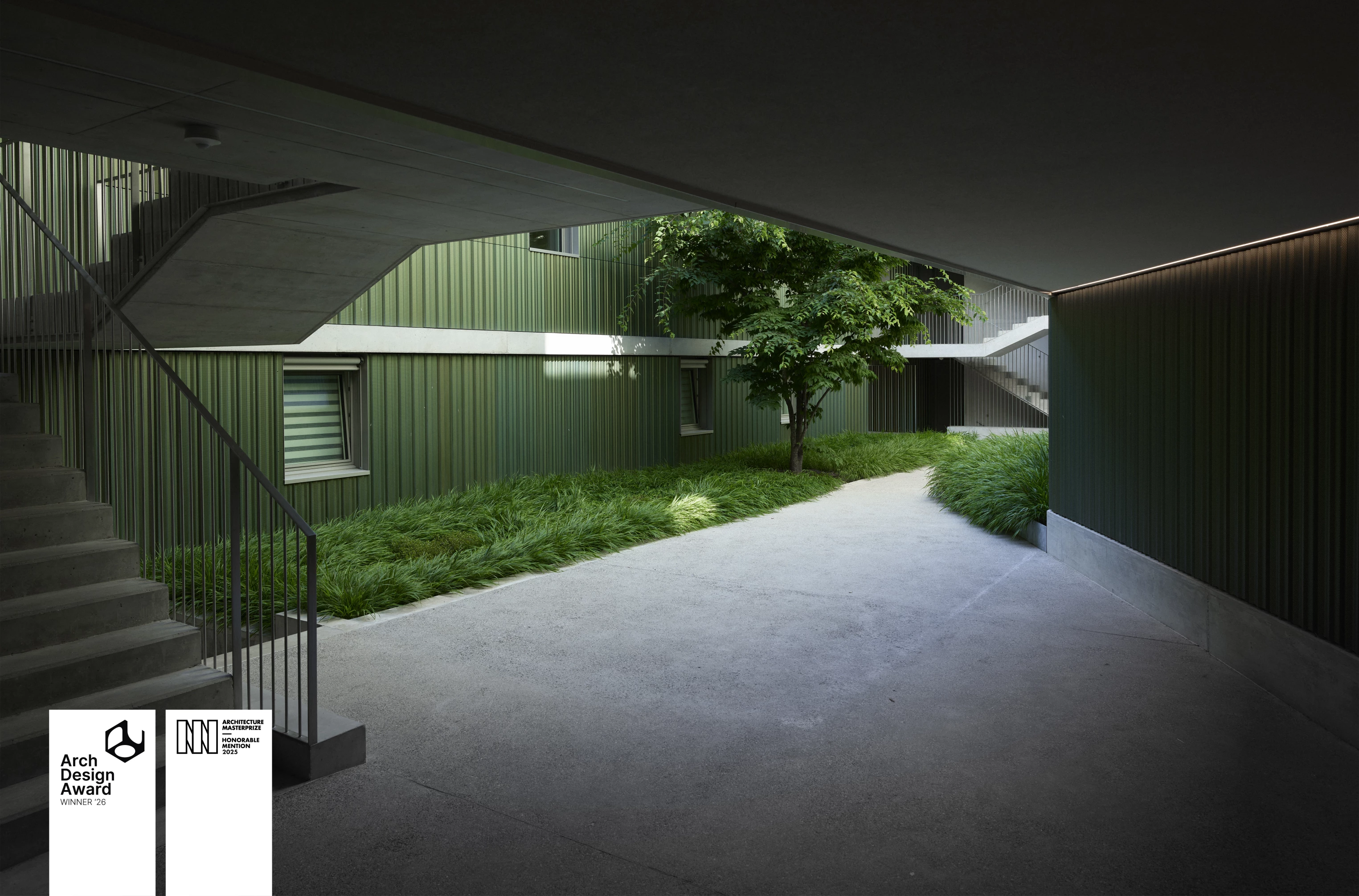Courtyard Housing is a residential project in Eysins, which asks to insert a building within a village area. With its inner courtyard and gables, the project embraces the codes of local architecture to densify the urban area while minding its context.