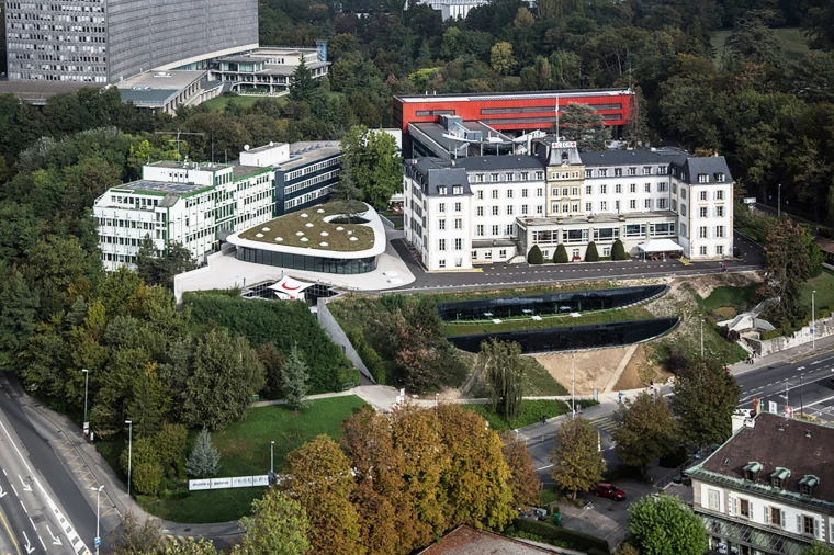 For this extension, a first building grounds in the slope below the old Hotel Carlton that holds the ICRC's facilities. This addition combines the offices and conference rooms. Its facades remain minimal, only showing two horizontal glass strips to the street. Another building lies on the top end of the site. Its organic shape allows smooth interactions with neighbouring constructions. It also embraces centenary cedar at its entrance. Thanks to a bearing glass structure and a concrete top, the building's presence is ethereal, which furthers earlier strategies to highlight the site's historical architecture.