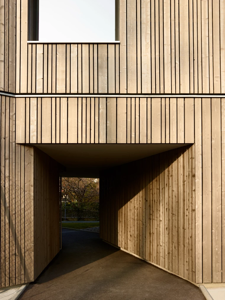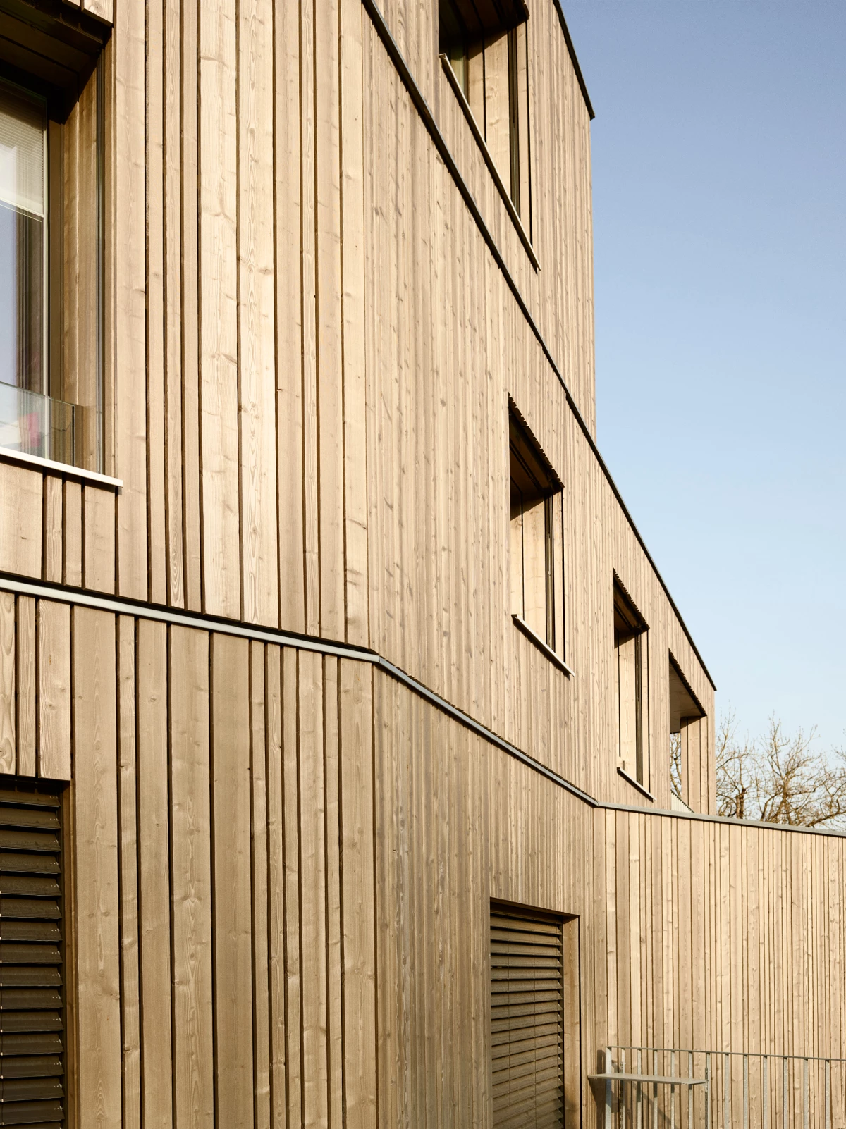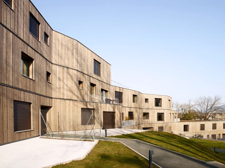 The building sits along the street's side to preserve trees and give striking views of nature. With its cascading shape and various levels, the building adjusts to the site's slope. This device allows every apartment to have openings on two fronts and a large terrace facing the Salève. While many geometrical shapes compose the volume, wooden cladding fuses the different parts. Wood also blends the architecture with its original setting.