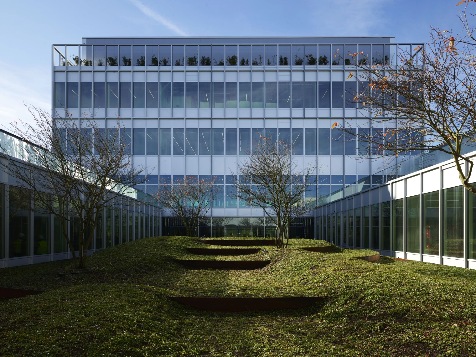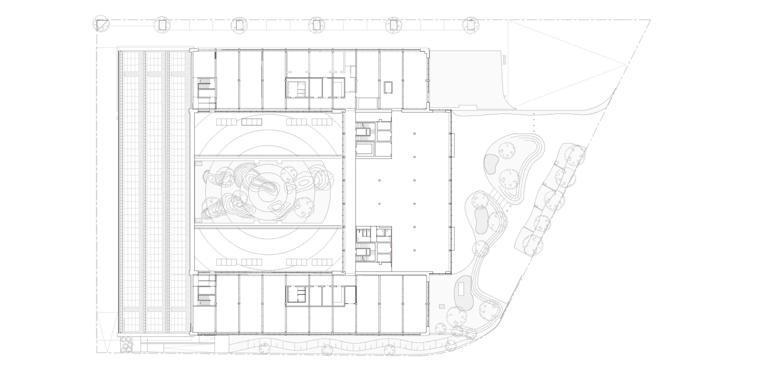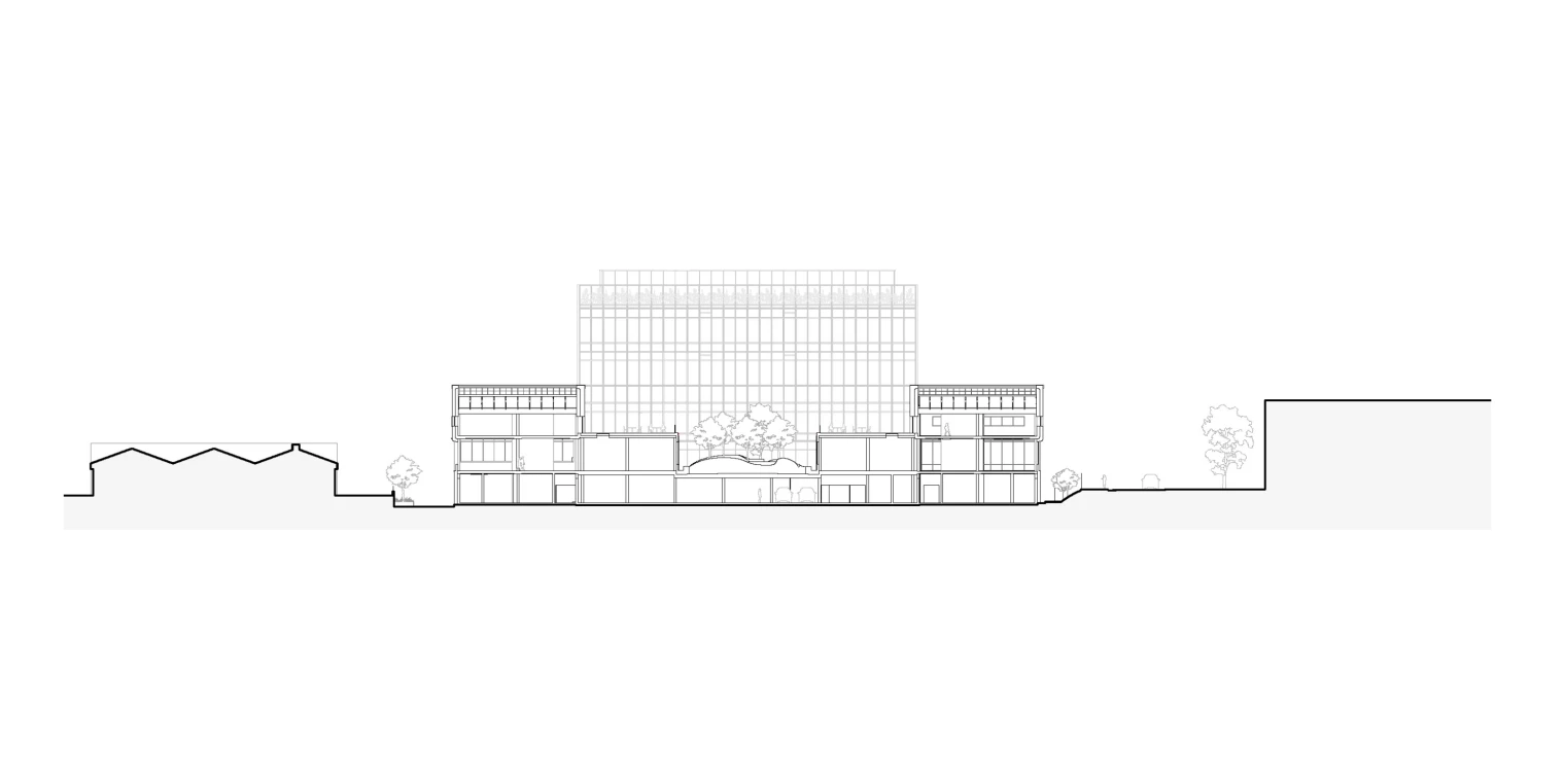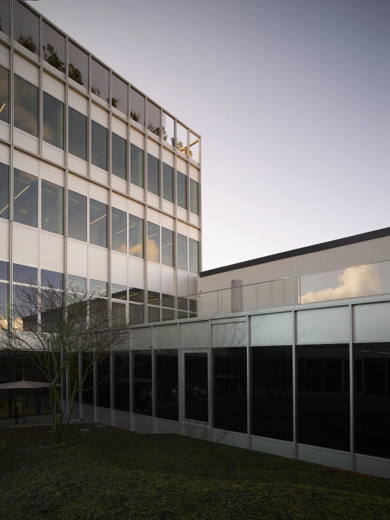 The original spatial organization—structured in a U-shape around a courtyard—has been preserved and enhanced. Two extensions complement the existing structure, redefining a landscaped inner courtyard that acts as the project’s green lung. This central void structures the ensemble, connects the different entities, and establishes a fluid dialogue between old and new. A new building completes the courtyard, following a principle of interlocking: a contemporary architecture that grafts itself precisely onto the existing structure, respecting its proportions, rhythms, and constructive logic. Through this measured intervention, old and new merge into a coherent and continuous whole, where the original industrial rigor is combined with the clarity and precision of contemporary design. This architectural graft, both legible and harmonious, reveals the complementarity between heritage and innovation—a gesture that is at once discreet and assertive, allowing the Manufacture to find its balance between memory, functionality, and modernity.