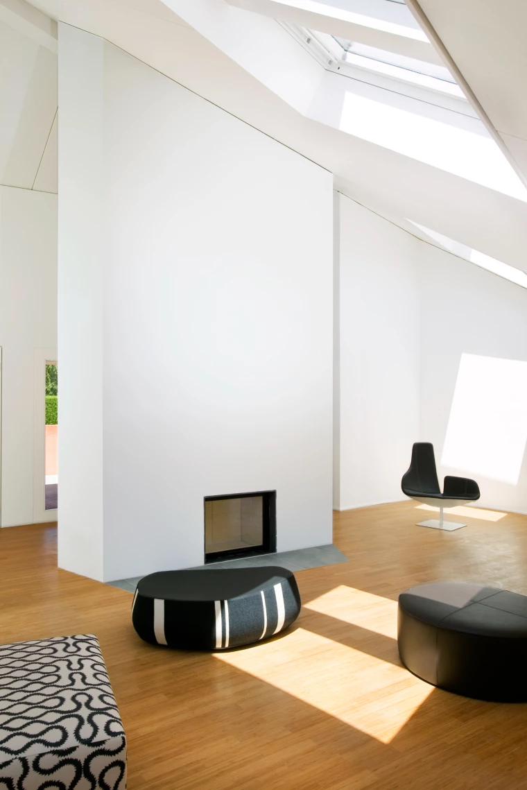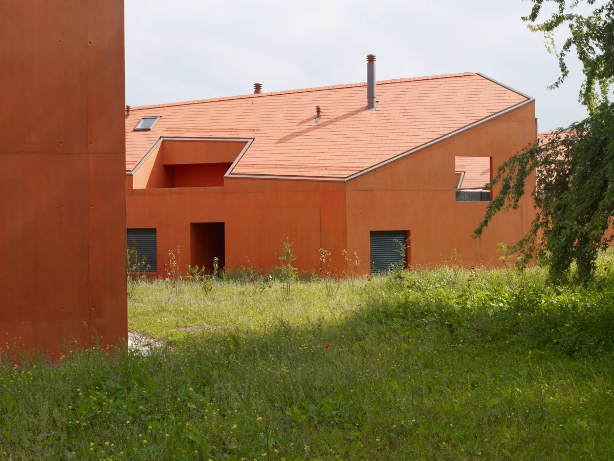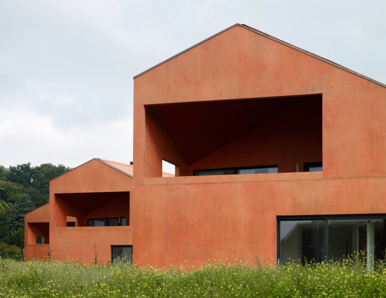 Each House works as a consistent, polyhedric block, comprising two apartments. The unique typology accentuates relations to the landscape and favours views on the southwest front. Like a series, all houses share the same design repeated over to fill the plot. With this modular element, the project suggests a system that could, like at Big Field Housing, repeat itself to form the fabric of a residential district.