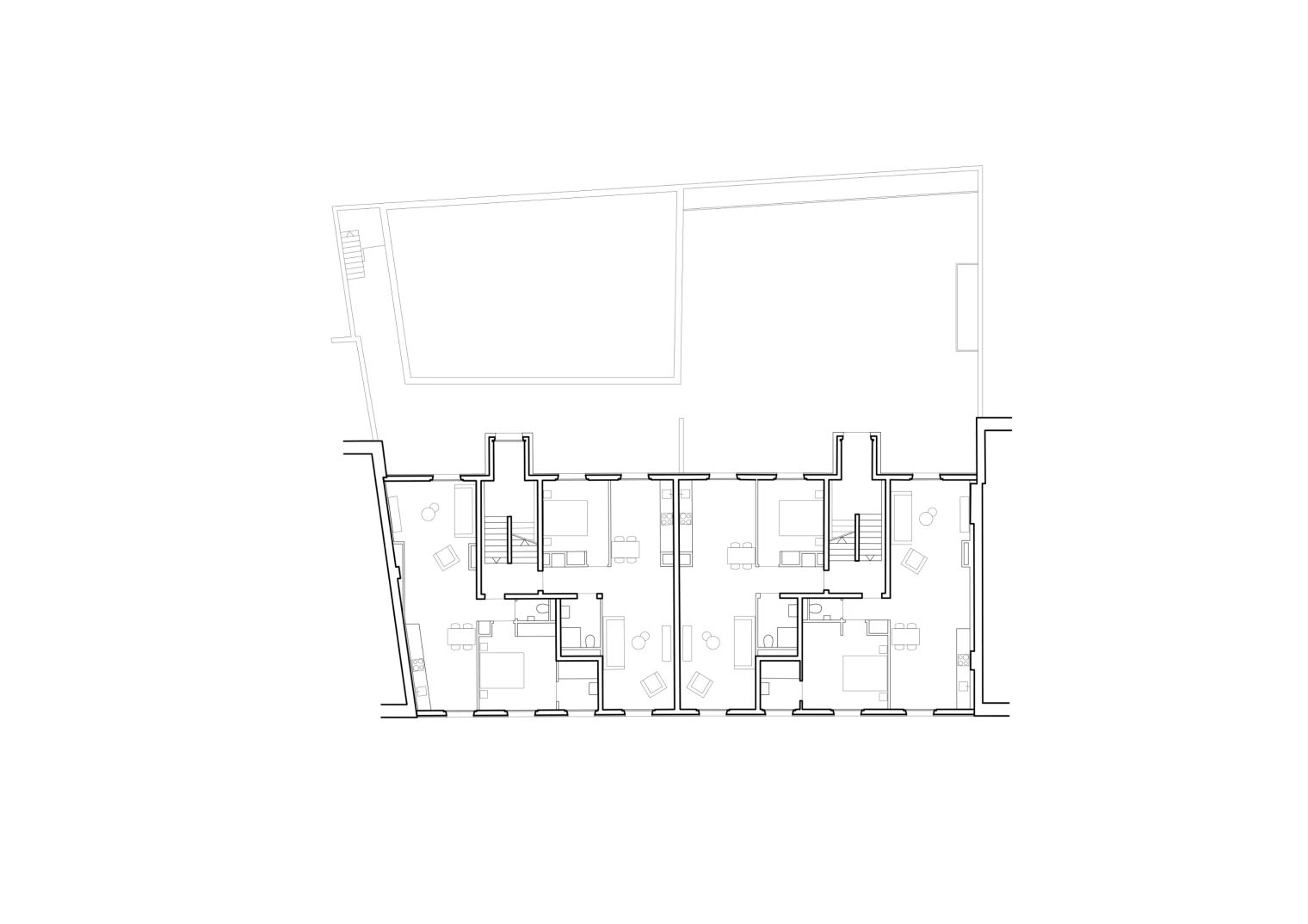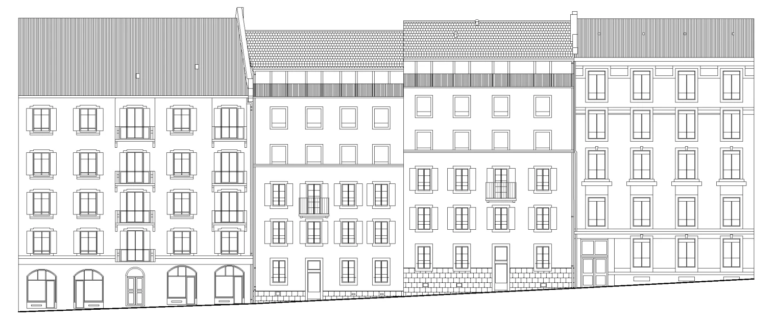 Elevation project in the centre of Geneva, Prieuré Housing aligns with the front roofs of neighbouring buildings, which helps clearly define the streets roofline. On the fronts, old and new bind seamlessly thanks to a coating of the whole. New windows follow the rhythm and alignment of existing openings with contemporary frames. Similarly, the last storey’s long balcony echoes the crowning of the adjacent 19th-century building with current handling and materiality—an abstraction that prolongs the existent.
