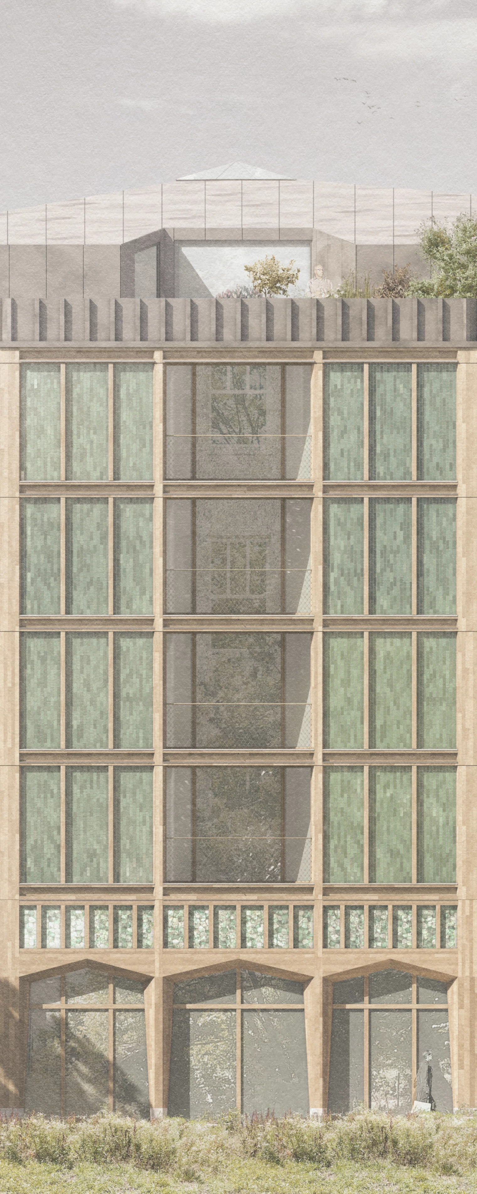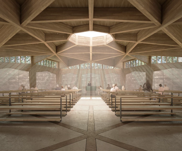 Sculpted by the natural surroundings, the building blends harmoniously into the existing landscape. Its geometry is inspired by the Huguenot cross, creating a spatial composition that resonates with the temple itself. Our vision for this project is to create a building that is sustainable, user-friendly and respectful of the environment, while honoring the rich past of this unique location.