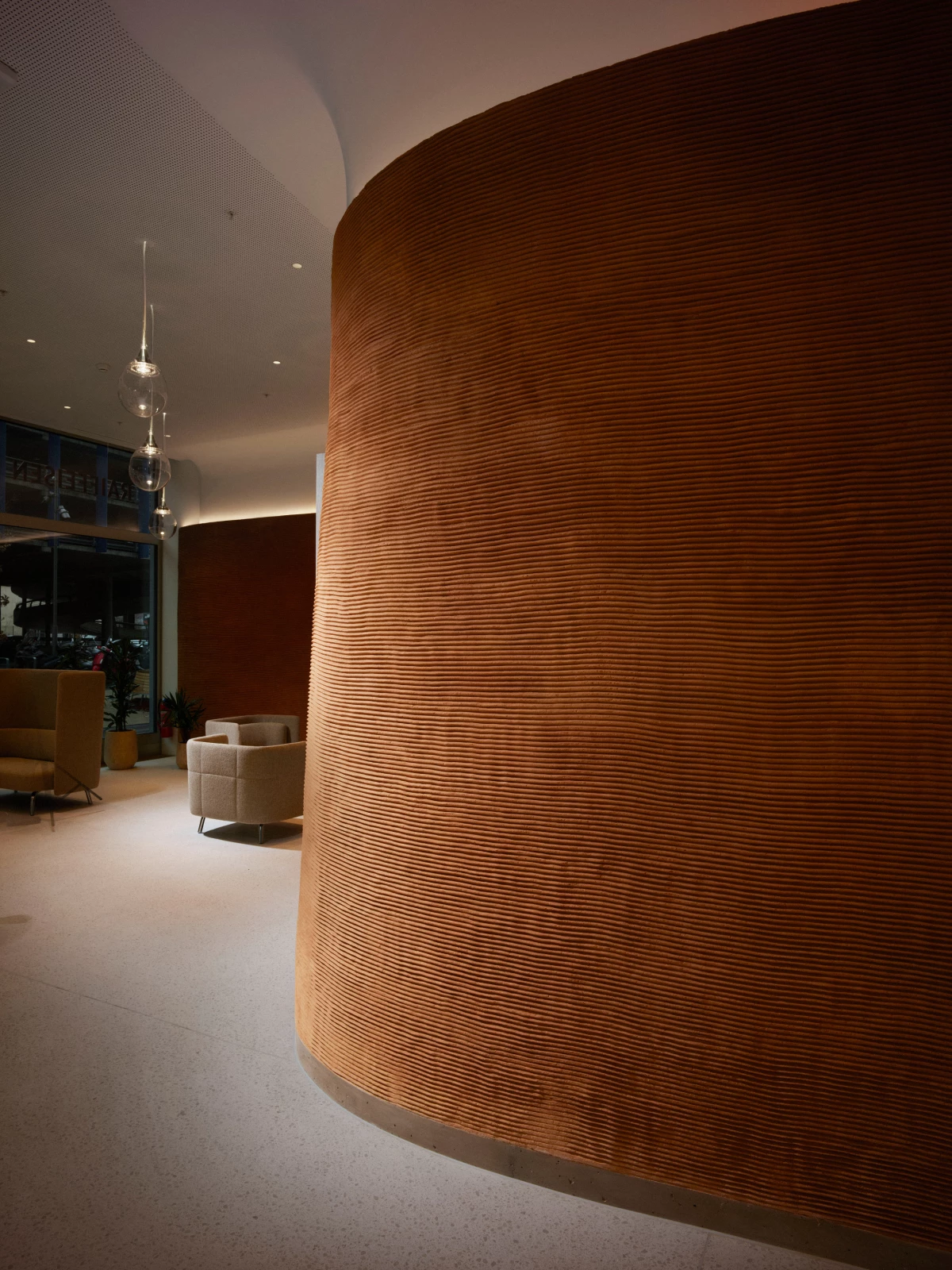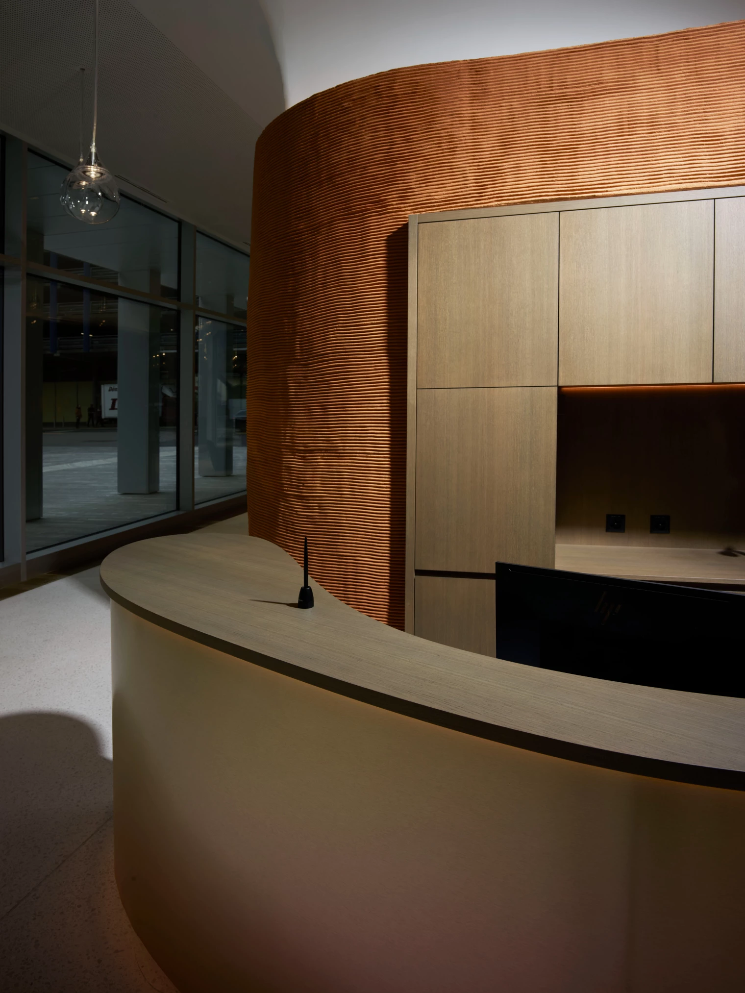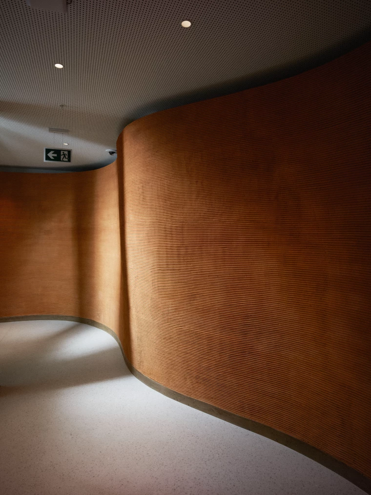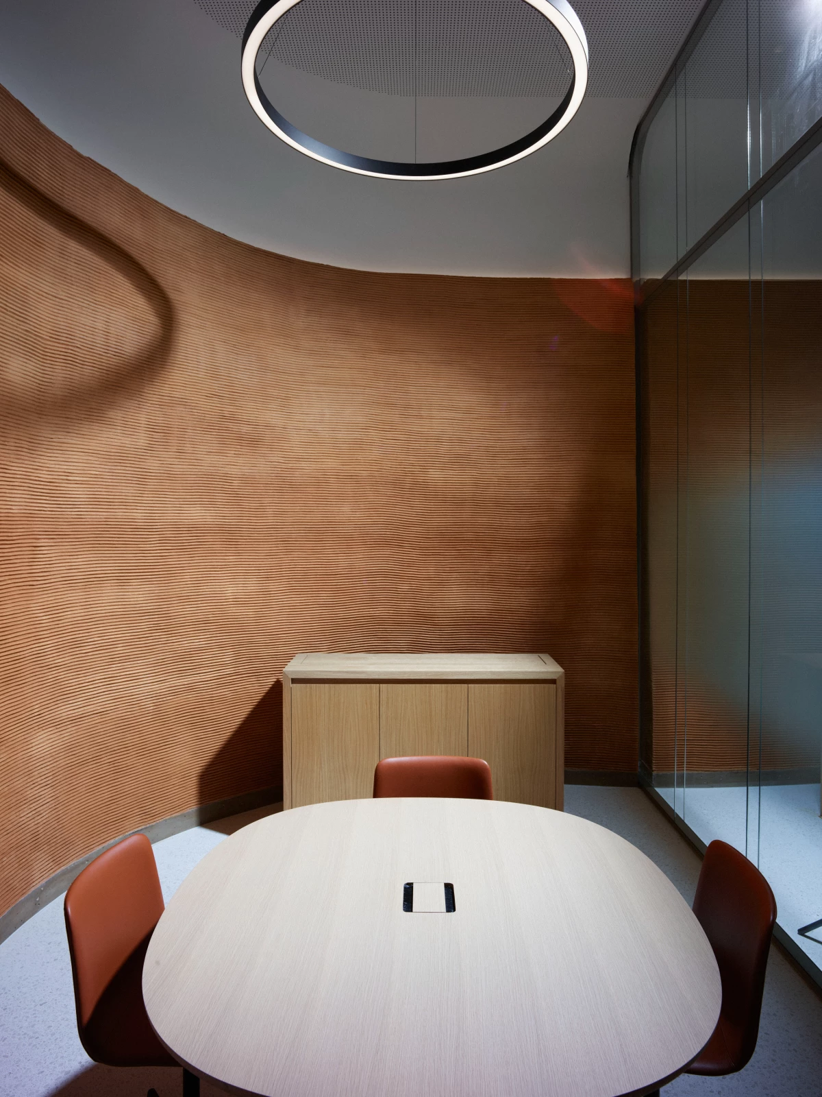 Visible from the outside, its soft, rolling geometry guides the visitor into this warm universe. Its rounded, concave, and convex shapes help organically connect different spaces. Its texture, composed of striated horizontal layers, evokes the furrows of agricultural fields. It links the various programmatic elements that make up the place: the reception area, five conference rooms, seventy-three workstations, five private lounges, and a convivial zone; the "green lung" of the project.