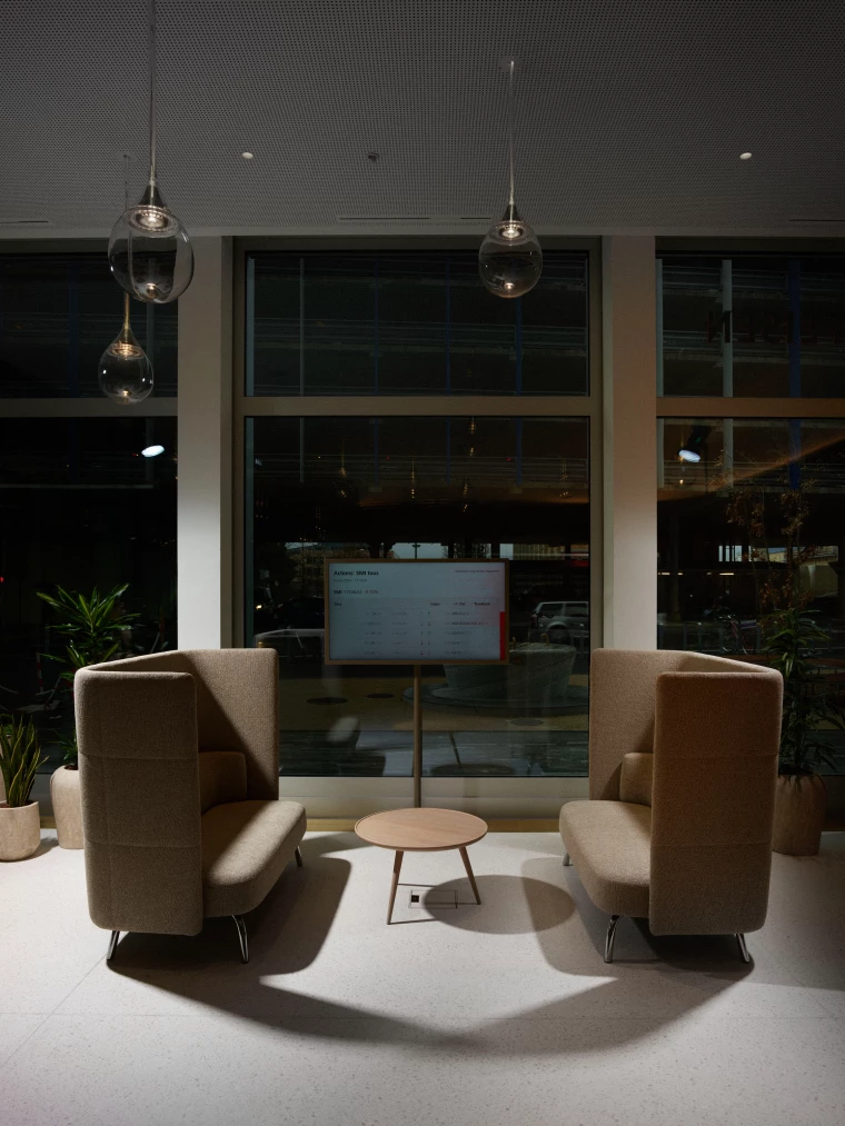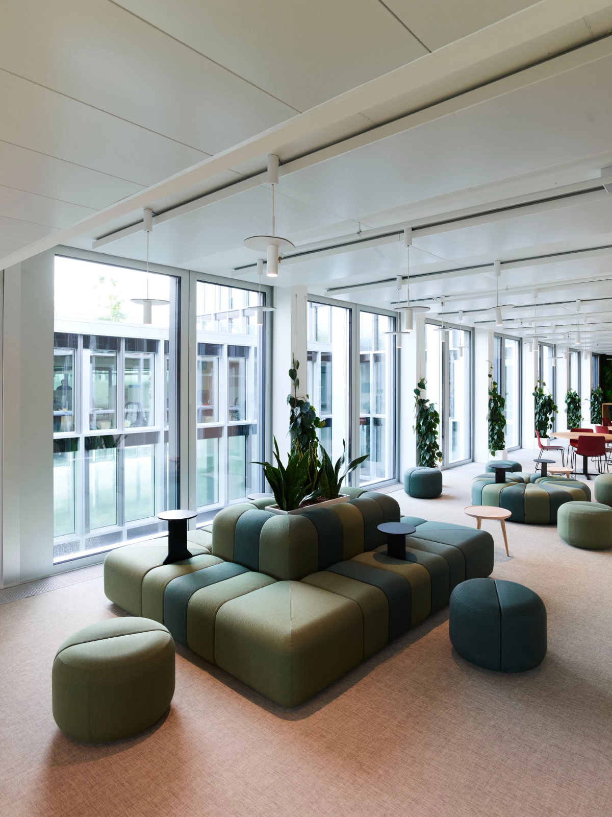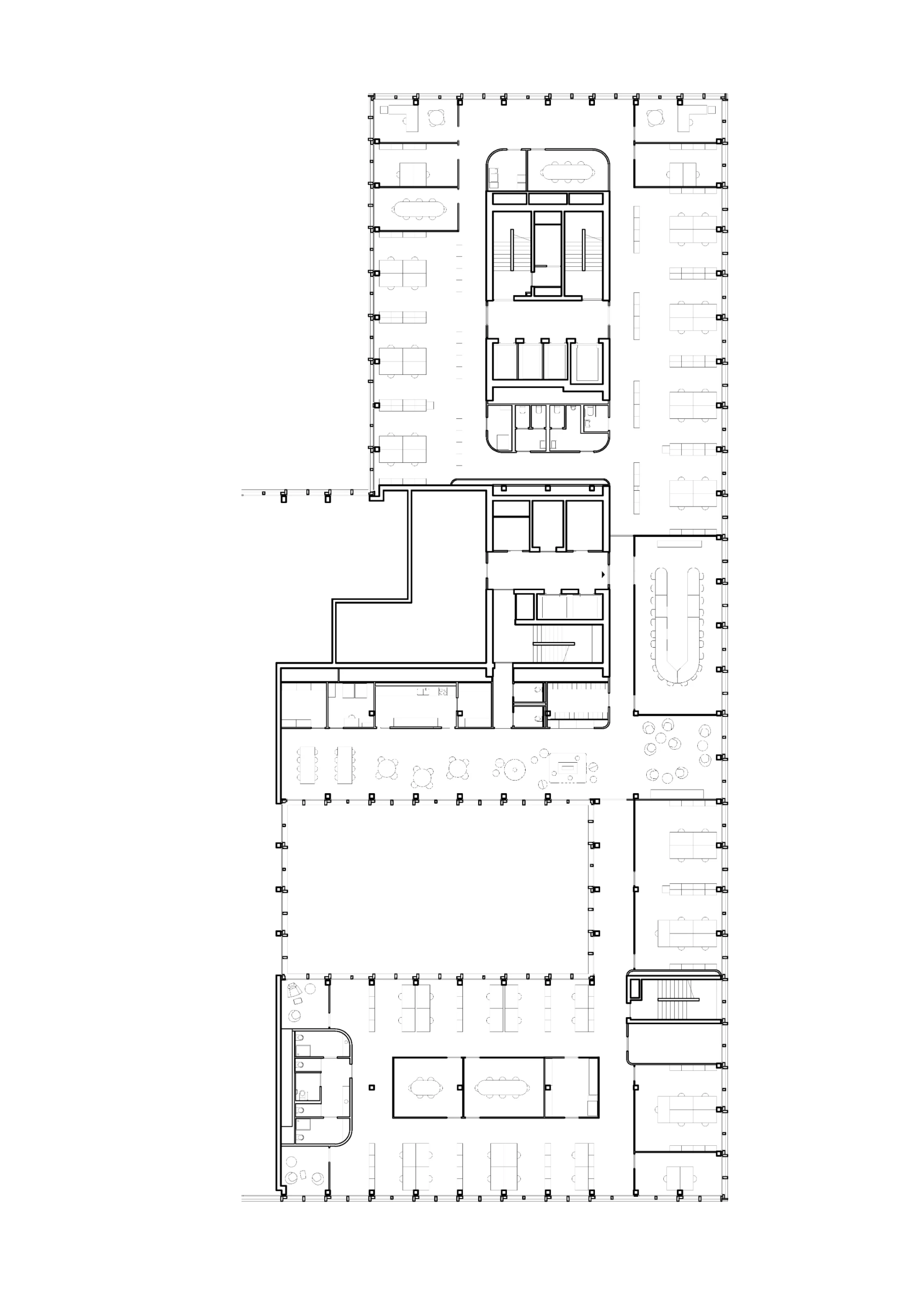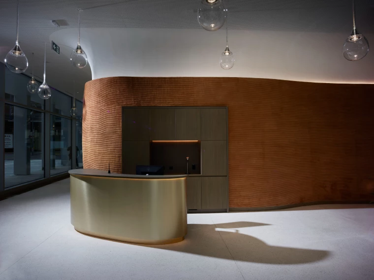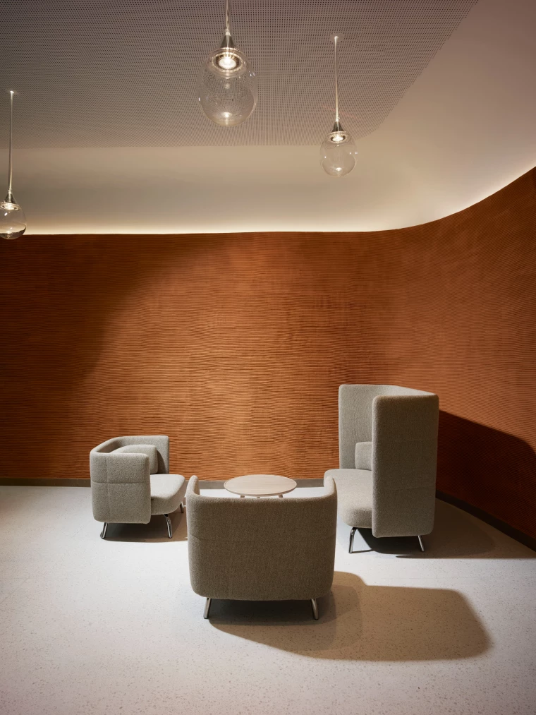 Visible from the outside, its soft, rolling geometry guides the visitor into this warm universe. Its rounded, concave, and convex shapes help organically connect different spaces. Its texture, composed of striated horizontal layers, evokes the furrows of agricultural fields. It links the various programmatic elements that make up the place: the reception area, five conference rooms, seventy-three workstations, five private lounges, and a convivial zone; the "green lung" of the project.
