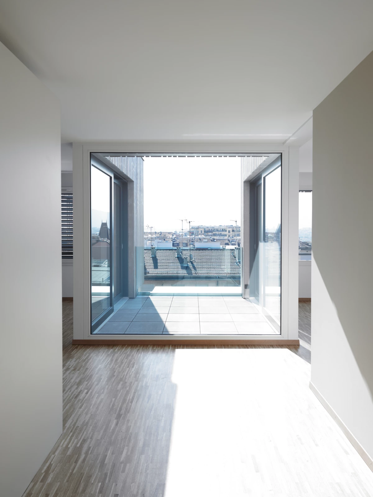 Wood in the Sky is a project for densification in Geneva's centre. It is an addition of an extra storey on an existing elevation. This project, developed by our founding partners during their time at group8, demanded to build above occupied dwellings. Six crossing apartments stand on one side and another of three staircases. Living rooms benefit from sunlight on Daubin street, while bedrooms lie on the courtyard side. A loggia articulates the plan. Its case overhangs, which allows daylight inside the dwelling while protecting inhabitants from neighbours' gaze. Facades bear wooden cladding that goes down the previous elevation, linking together all elements of the attic.