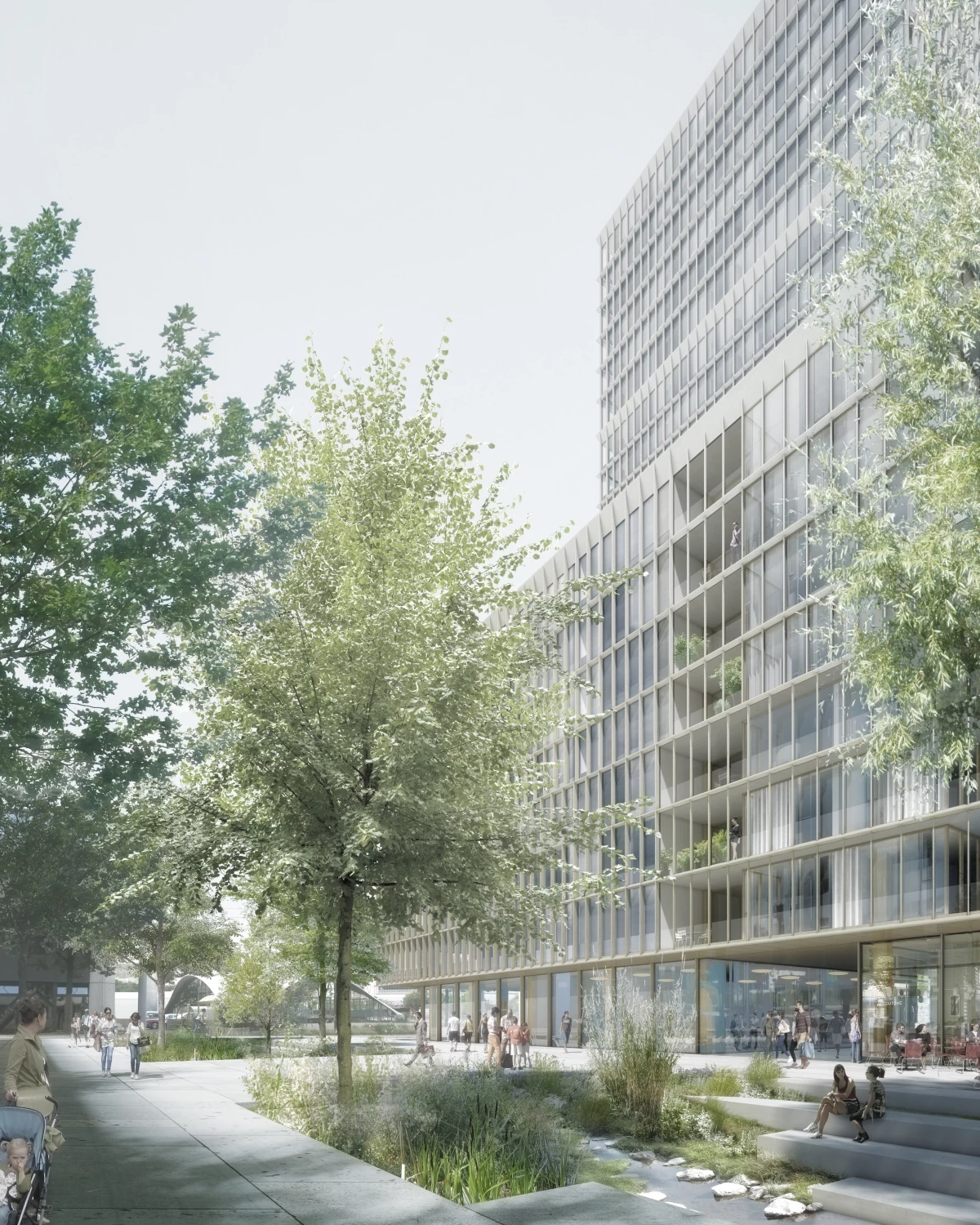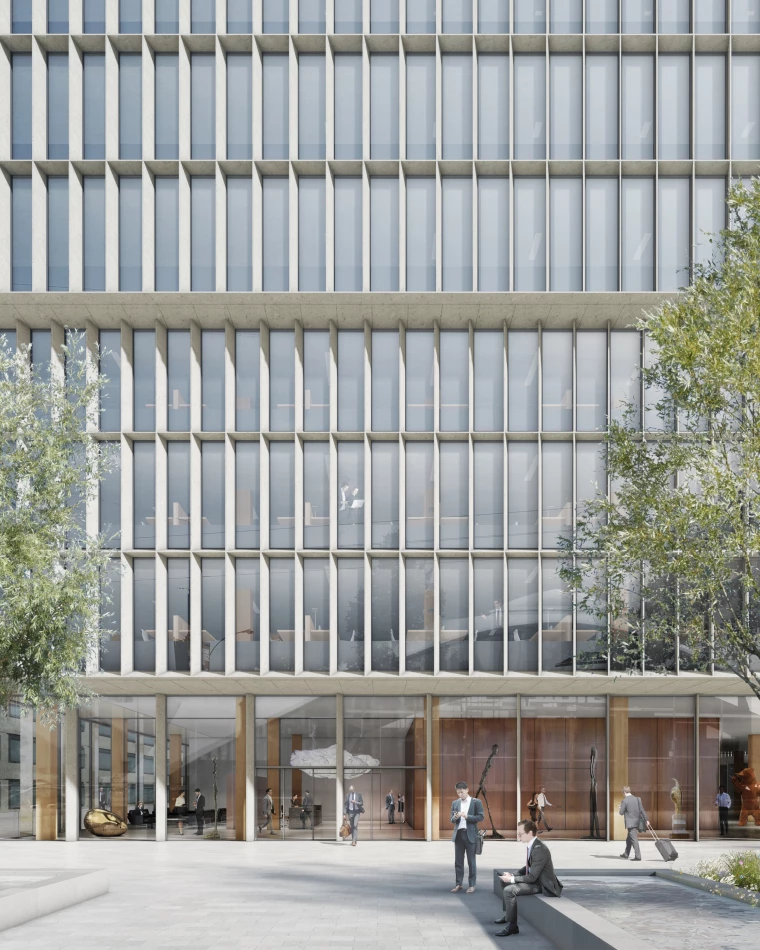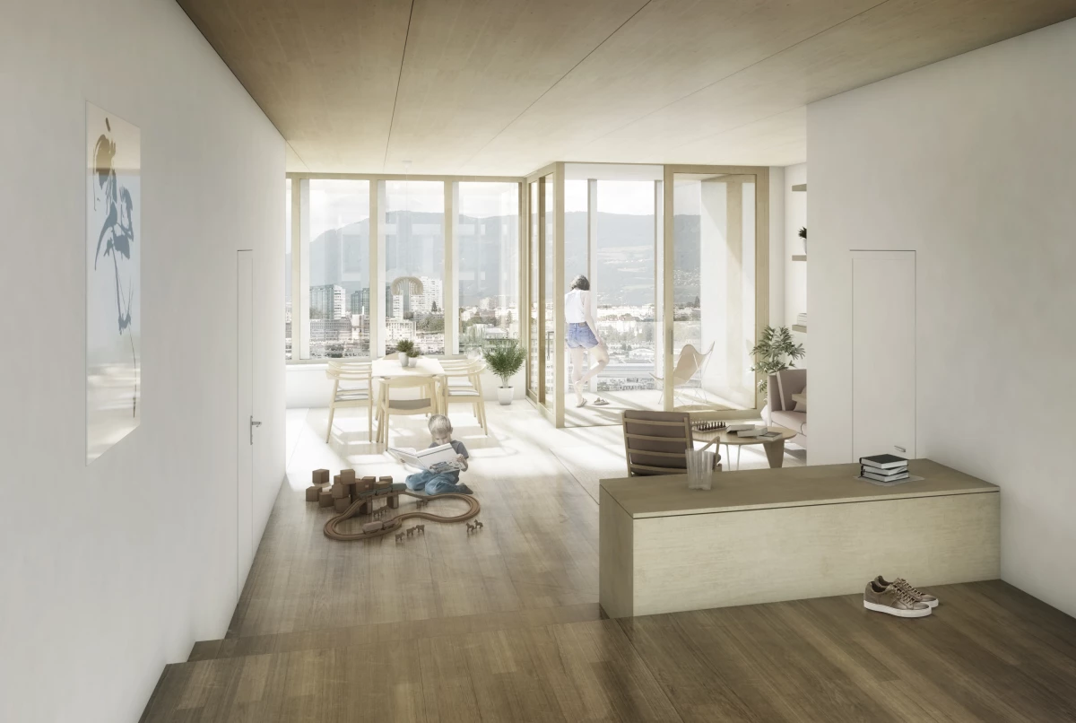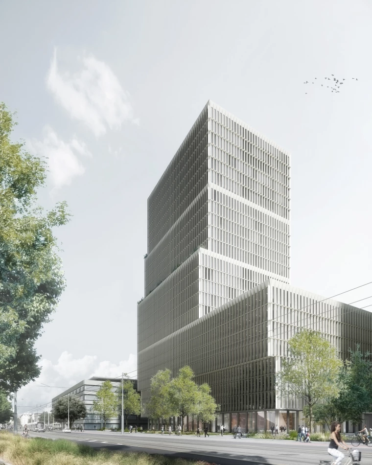 Dans ce projet, l’îlot, traité comme un seul objet, est décomposé en plusieurs volumes pour répondre au programme. Ces découpes volumétriques font écho à la forme du bâtiment existant de la banque. Chaque décalage est une opportunité de créer des terrasses qui font faces aux éléments majeurs du paysage genevois. Avec son expression mesurée et unitaire, le bâtiment traduit des valeurs intemporelles de stabilité, de sobriété, et de qualité. Sa matérialité - une enveloppe de pierre et une structure en bois - exprime d’emblée une construction durable. A l’intérieur, un grand hall tempéré permet de gérer les flux depuis les différentes entrées publiques.
