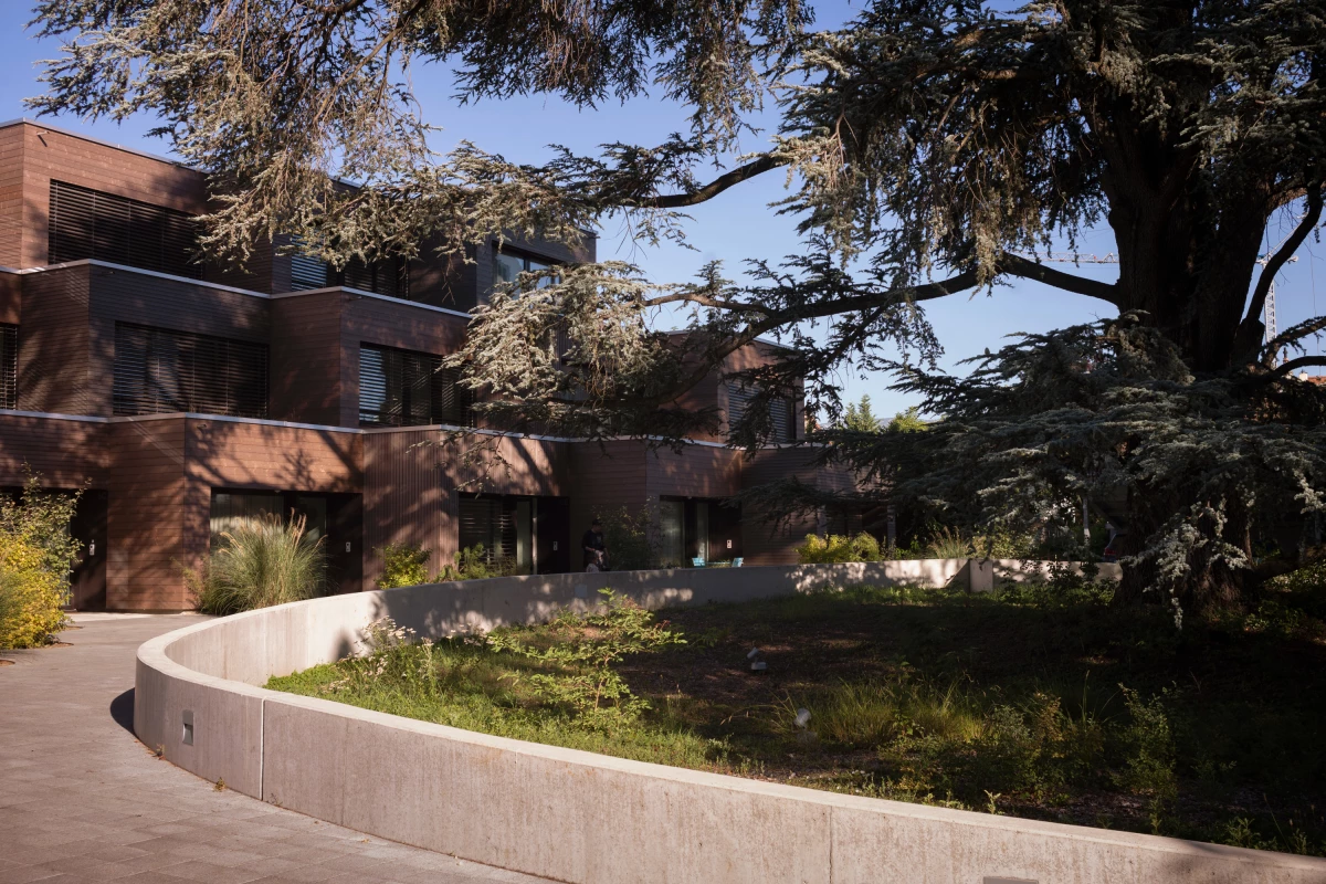 Centré autour d’un cèdre centenaire, Cedar Housing raconte l’histoire de cabanes perchées dans les arbres. La forme du bâtiment épouse la ceinture végétale semi-circulaire définie par la couronne de l’arbre. Avec son architecture d’immeuble à gradins, l’ensemble rappelle un amphithéâtre. La cour qui englobe l’arbre est lieu de partage, regroupant toutes les activités en collectivité. Si cette face du bâti privilégie le vivre ensemble, c’est à l’inverse la privacité qui est à l’honneur côté jardin, grâce aux plis et redents de la façade.