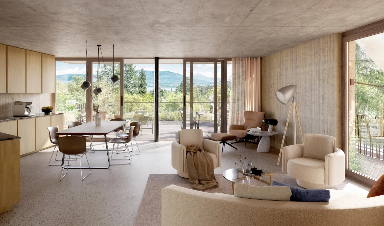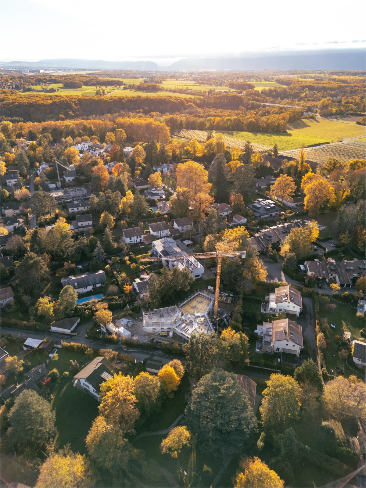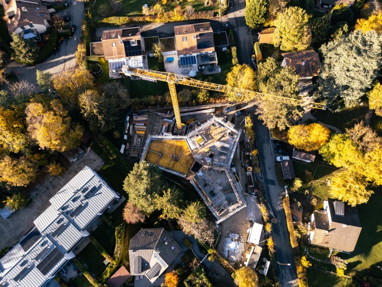 À Versoix, le projet s’inscrit dans un quartier de villas en mutation vers une densité maîtrisée. Implanté au centre d’une parcelle triangulaire, le bâtiment en forme de trèfle préserve les arbres existants, renforce les séquences végétales et limite les vis-à-vis. La fragmentation en trois pétales réduit l’impact volumétrique et s’aligne sur l’échelle bâtie environnante.