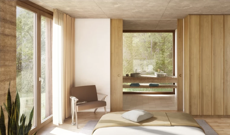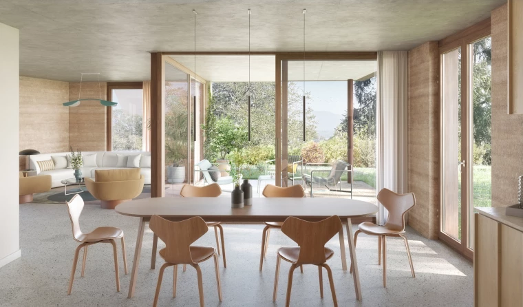 L’enveloppe privilégie les matériaux biosourcés : isolation en fibre de bois, crépi minéral à la chaux, structure en béton recyclé teinté. Les aménagements extérieurs prolongent l’identité végétale du site : chemin périphérique en copeaux, jardins privatifs, séquences paysagères continues.