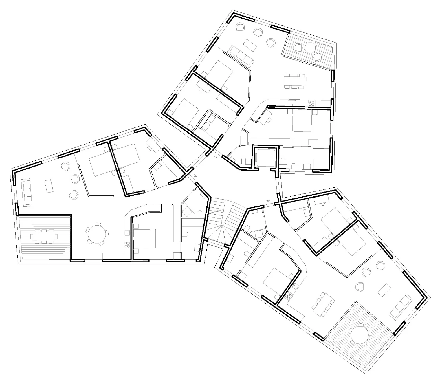 Le programme regroupe sept logements de 5 pièces et un attique. Chaque pétale constitue un appartement à quatre orientations, structuré autour d’une loggia et complété d’une pièce flexible. L’attique occupe seul le couronnement avec vues panoramiques. La distribution est organisée autour d’une cage d’escalier centrale éclairée naturellement et d’interstices végétalisés.