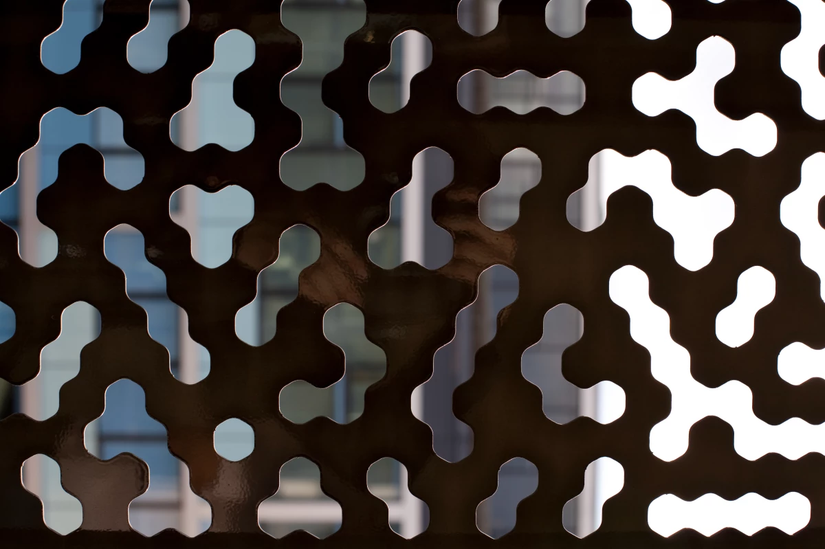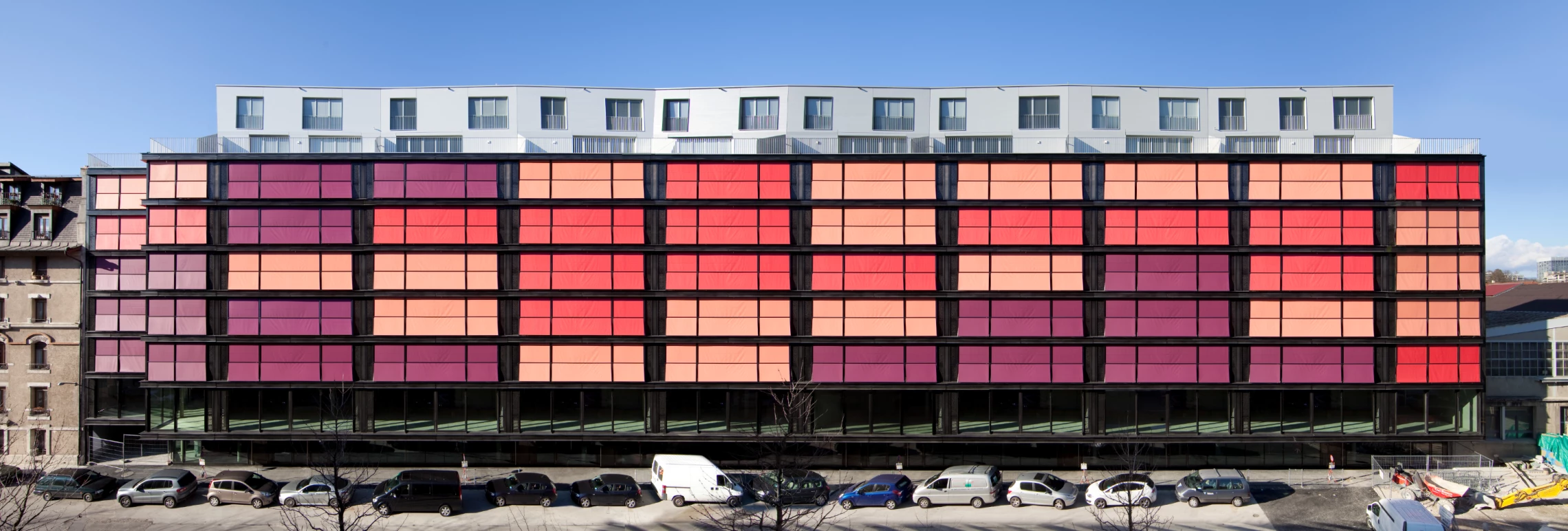 Conçu par nos associés-fondateurs au moment de group8, l’immeuble sans balcons revêt d’une façade faite de larges baies vitrées pour une continuité maximale entre intérieur et extérieur au niveau des espaces à vivre. Des stores oranges, rouges et aubergines se déclinent sur cette façade. Les caisses de ventilation qui séparent les baies vitrées sont couvertes de plaques métalliques ajourées dont les motifs coralliens se reflètent à la lumière du jour. En opposition à la façade très ouverte côté rue, les chambres côté cour bénéficient d’une façade en crépi avec fenêtres pour plus de privacité. En attique, nous retrouvons comme pour Résidence Bambou des logements en duplex dont la forme est ondulée. Revêtue de tôle en aluminium, cette partie supérieure à l’allure discrète s’estompe dans le ciel.