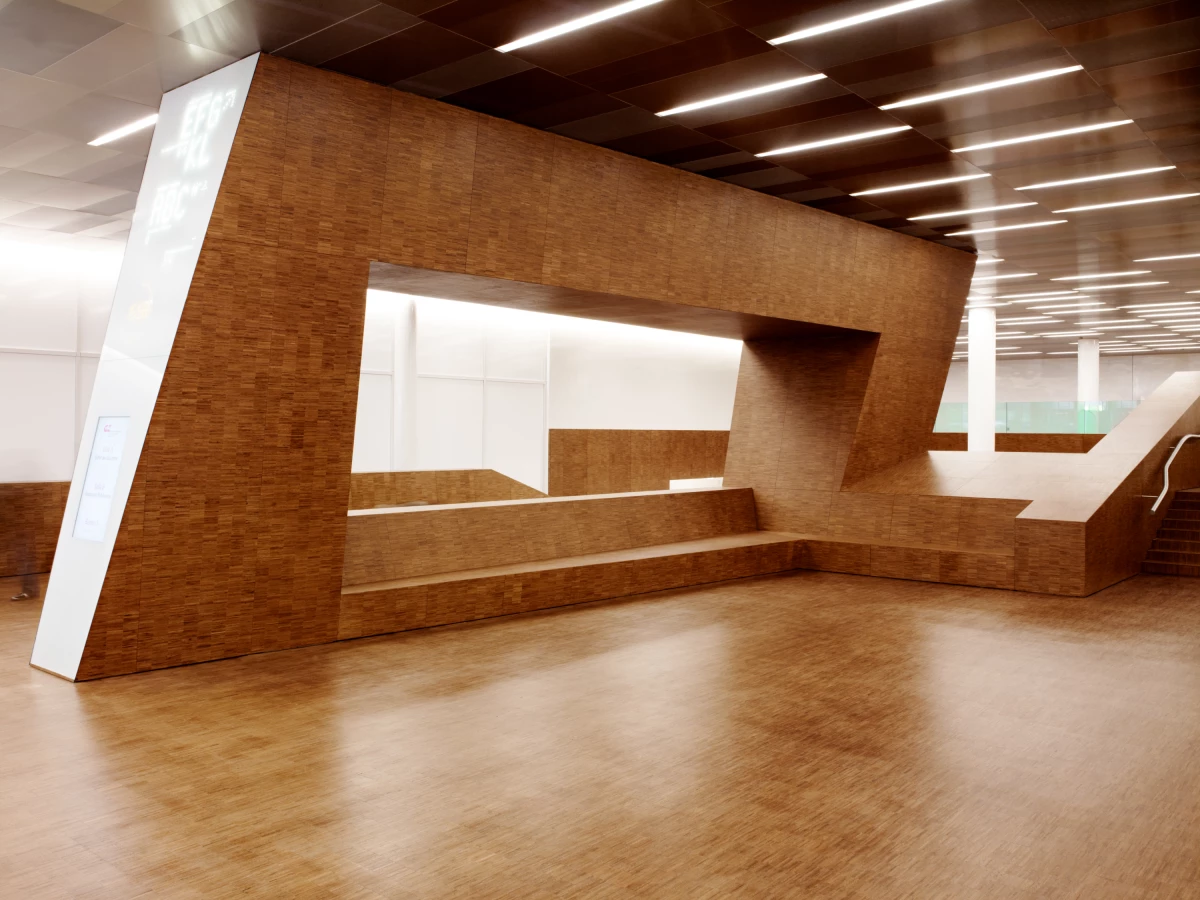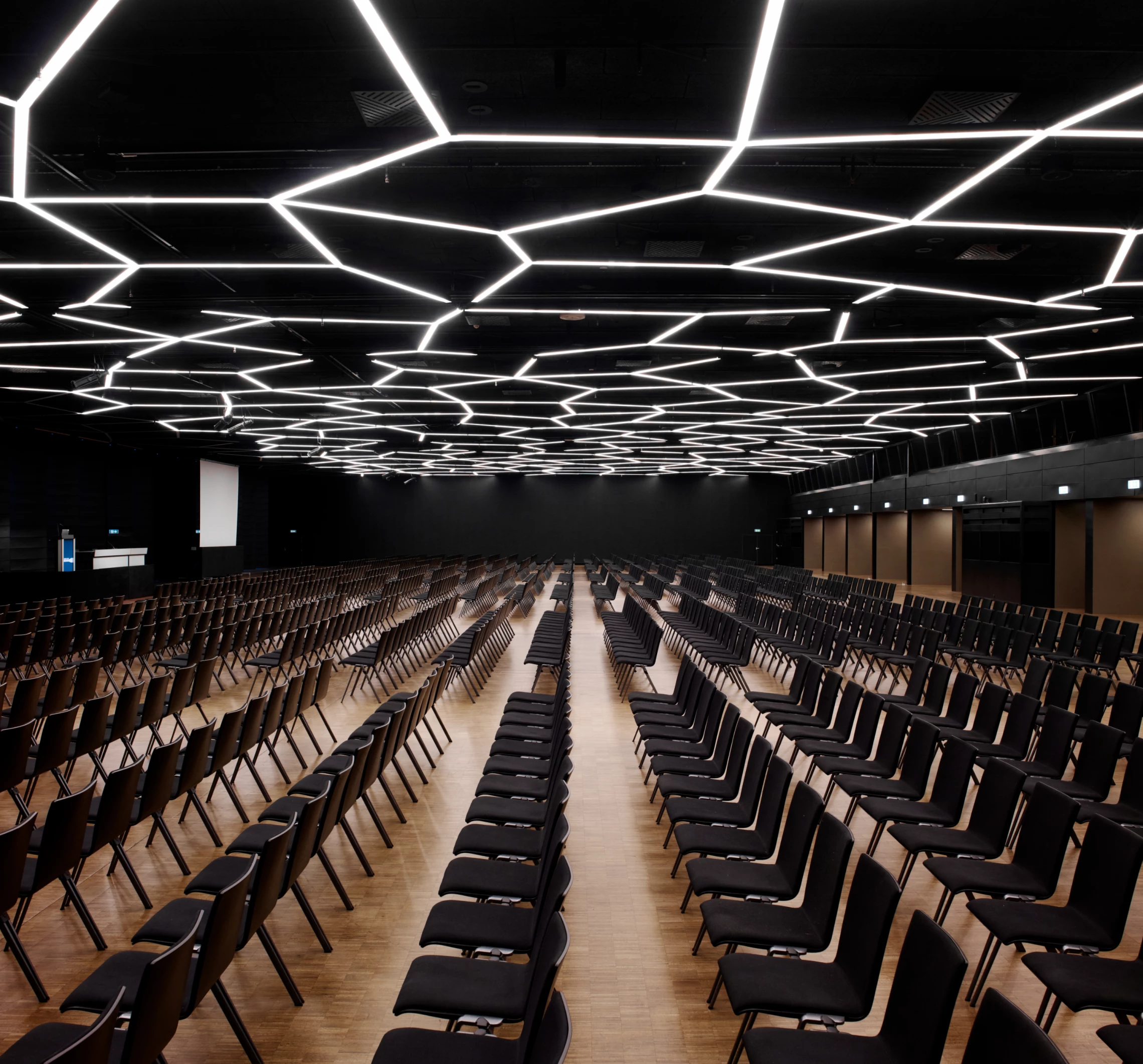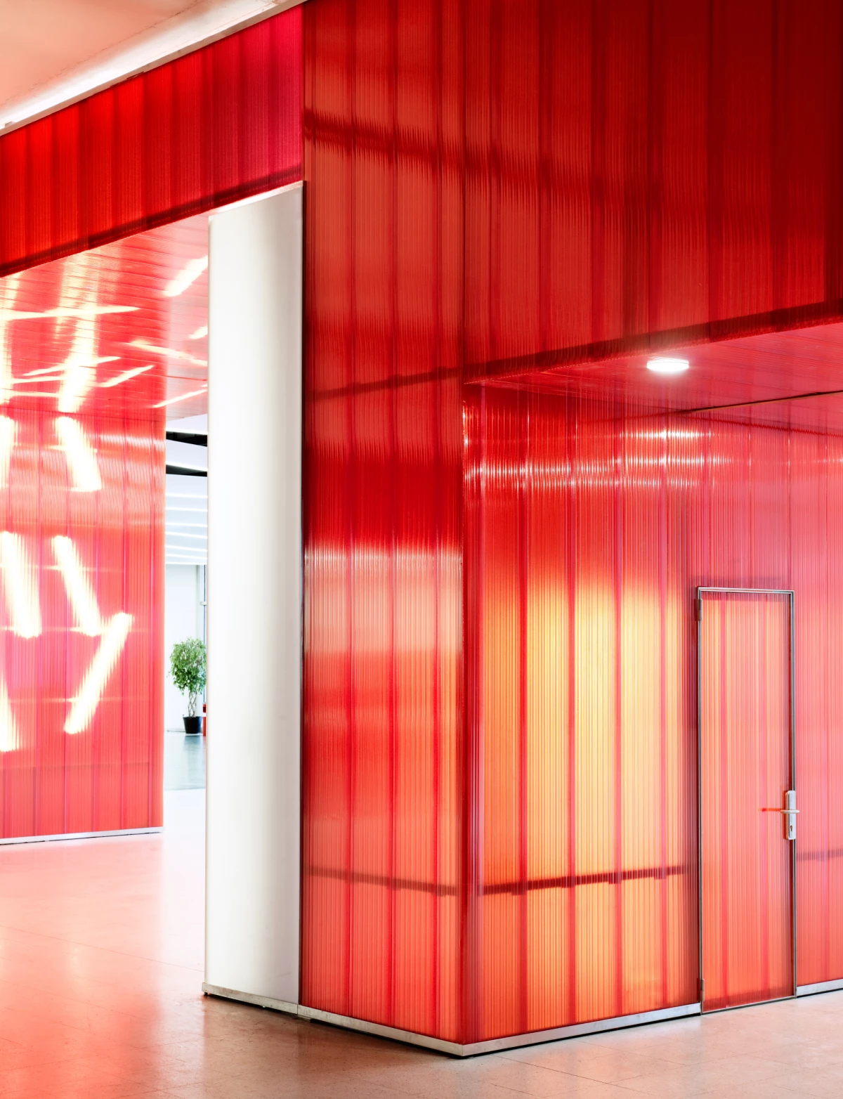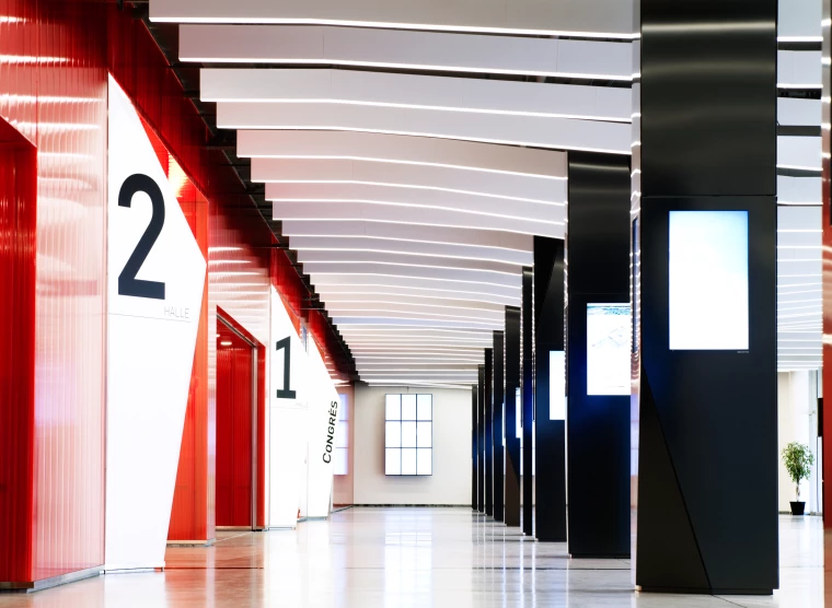 La rénovation et transformation de Palexpo s’est déroulée en plusieurs étapes, un long phasage permettant de maintenir l’exploitation du bâtiment. Chaque espace a été pensé de manière distincte. Le hall d’entrée est devenu boulevard où des parois en polycarbonate rouge translucides se déclinent pour annoncer les différentes halles. Ailleurs, le foyer s’articule autour d’un grand escalier meuble unitaire permettant de diriger les flux de visiteurs et de devenir lieu de vie le temps d’une halte. La grande salle, elle, est définie par un faux plafond lumineux dont les éclairages forment un maillage géométrique en toile d’araignée. Partout, l’éclairage, cinétique et tubulaire, participe activement à la rénovation du lieu, apportant cadence et dynamisme à des espaces majoritairement perçus en mouvement.