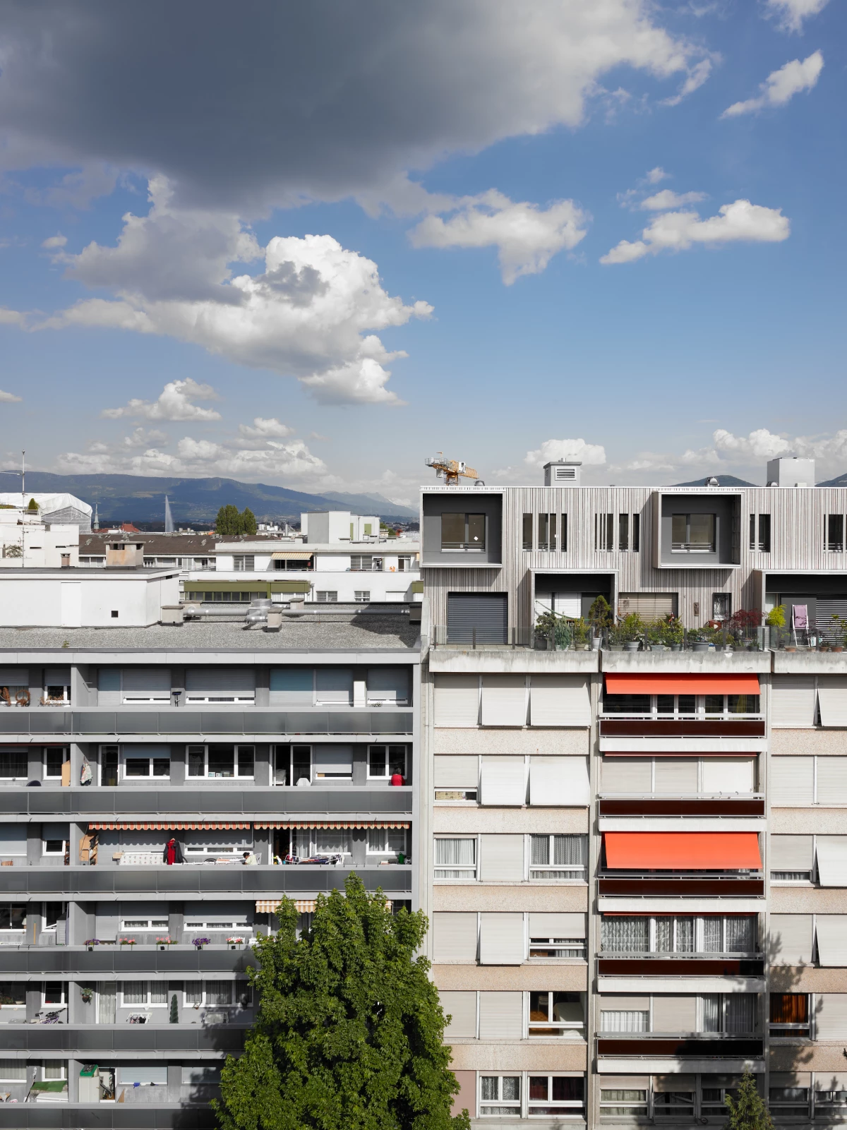 Wood in the Sky est un projet de densification en ville de Genève, venant poser un nouvel étage de surélévation sur une surélévation existante. Réalisé par nos associés-fondateurs à l’époque de group8, ce projet avait pour nécessité de construire au-dessus d’espaces occupés. Six appartements traversants se posent ainsi de part et d’autre de trois cages d’escaliers, avec espaces à vivre ensoleillés côté rue Daubin et chambres côté cour. Le logement se développe autour de loggias avec des cadres en saillie, qui amènent de la lumière dans l’ensemble du séjour tout en garantissant l’intimité des habitants face aux vues croisées. Les façades sont revêtues d’un bardage en bois qui descend sur la surélévation précédente afin d’unifier l’attique en apparence.